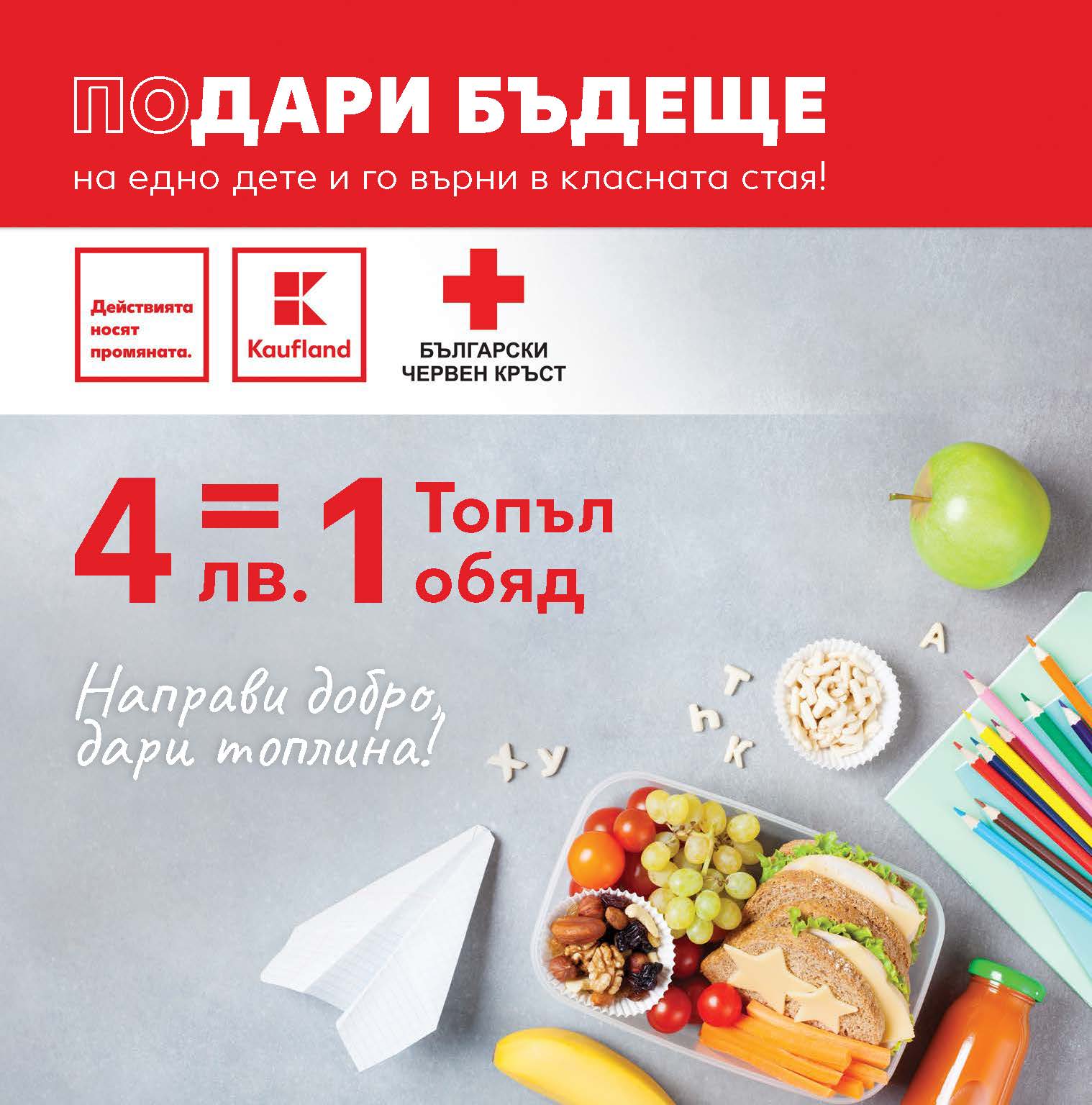 За поредна година Kaufland България се включва в традиционната дарителска програма „Топъл обяд“ на Българския Червен кръст (БЧК), благодарение на която се осигурява храна за ученици в неравностойно положение. От 11 септември до 15 октомври включително клиентите на веригата могат да дарят средства за дете в нужда в разположените специално за инициативата дарителски кутии във всички хипермаркети на веригата.