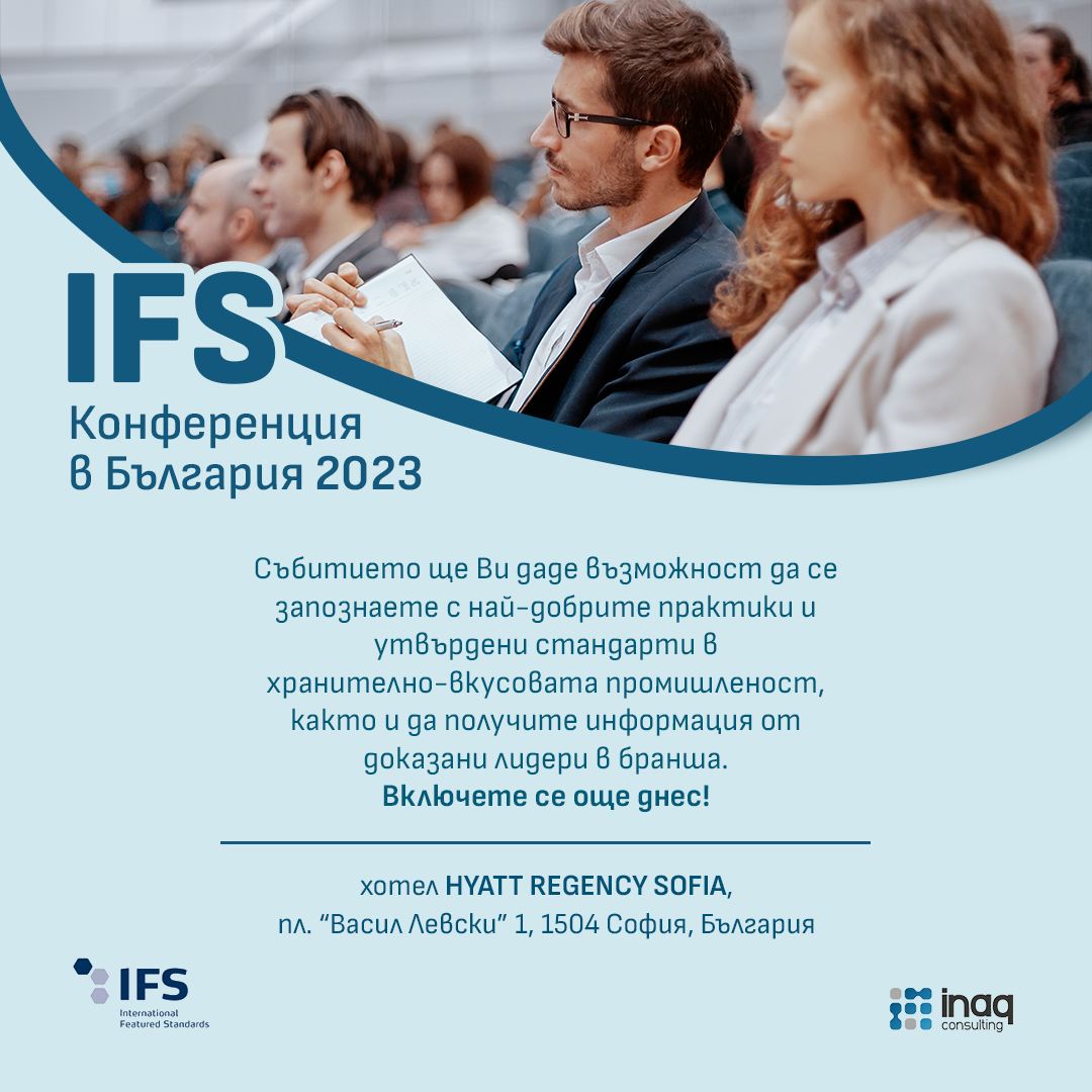 За нас – от списание ХИТ – Хранителна индустрия и търговия е удоволствие като медия - партньор за втора поредна година, да Ви поканим да се присъедините към IFS конференция в България. Тя е организирана от IFS Management GmbH и INAQ Consulting и ще се проведе на 20-ти ноември 2023 г. в хотел HYATT REGENCY SOFIA, пл. “Васил Левски” 1, 1504 София, България.