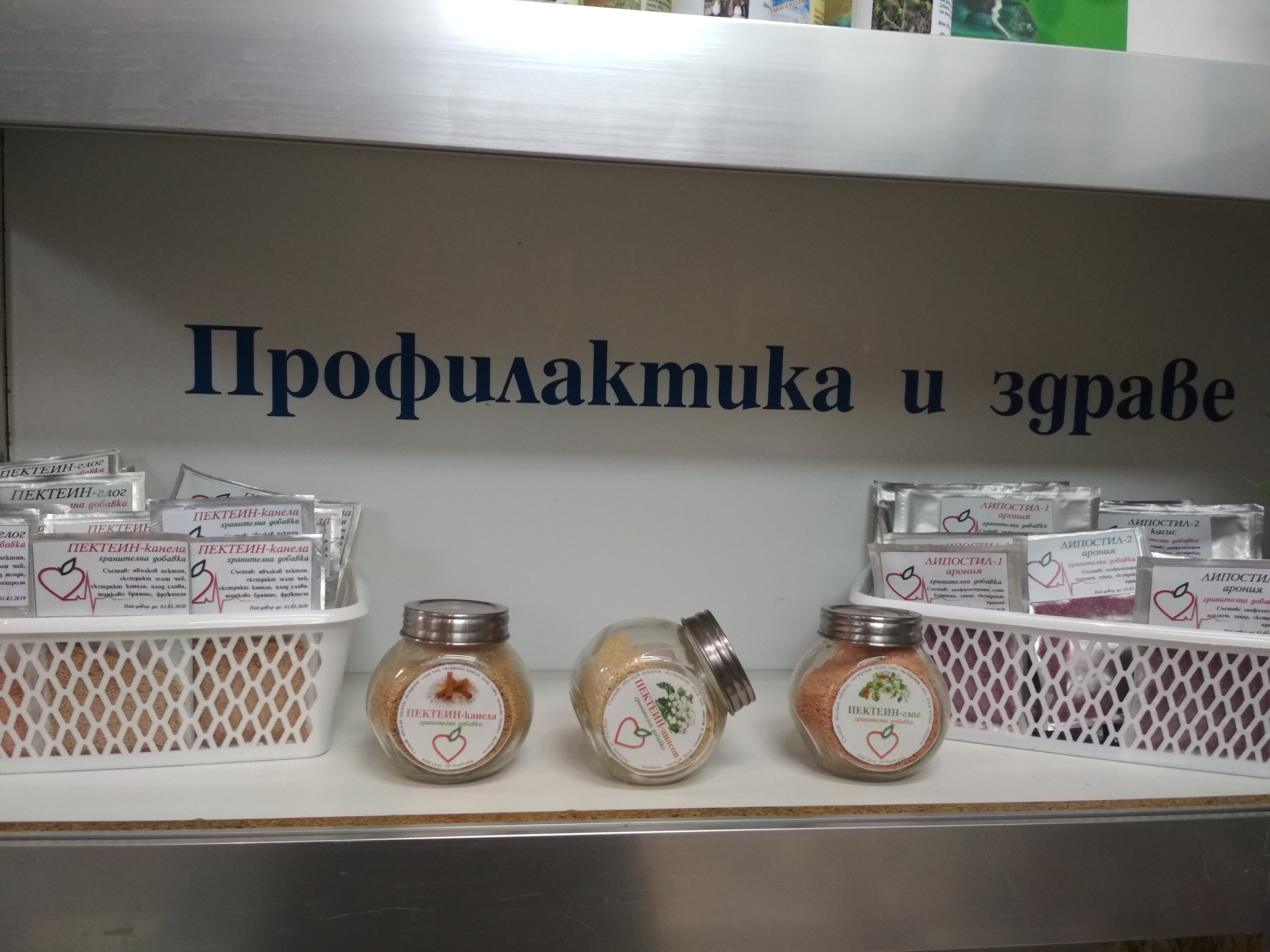 Ябълковият пектин притежава много ценни качества като диетичен продукт и като хранителна добавка при редица метаболитни заболявания. Пектиновите вещества неутрализират действието на киселините и основите и адсорбират бактериалните токсини, а нискоестерифицираните пектини образуват комплекси с тежките метали и подпомагат отделянето им от организма. Всички знаем, че прахообразният пектин трудно се разтваря във вода и полученият разтвор има неприятен вкус, ето защо разработихме технология за получаване на пектинови гранули с подобрена разтворимост и вкус, която дава възможност да се избегнат тези затруднения. Въз основа на нея е създадена серия продукти под името „Пектеин” съдържащи ябълков пектин, растителни екстракти и лиофилизирани плодове. Продуктите не съдържа изкуствени оцветители и консерванти, разтварят се лесно във вода, чай или плодов сок и имат приятен и свеж плодов вкус.