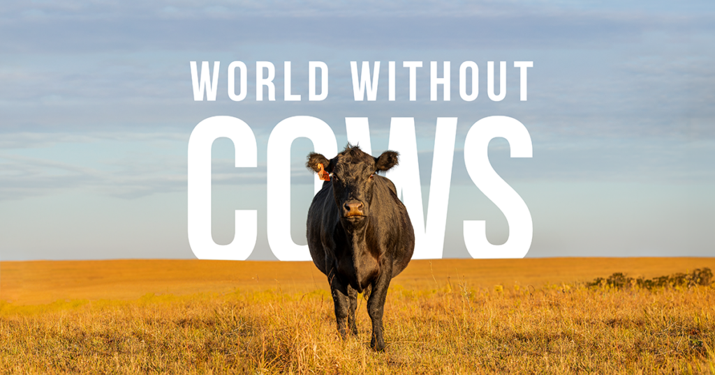 „Свят без крави“ приканва зрителите да се замислят за значението на животновъдството в нашето ежедневие и за решаващата роля на кравите в различните екосистеми. По време на целия документален филм експерти в областта на околната среда, храненето и селското стопанство предлагат данни и проучвания, които развенчават митове и отварят дебат за връзката между производството на храни и опазването на околната среда.